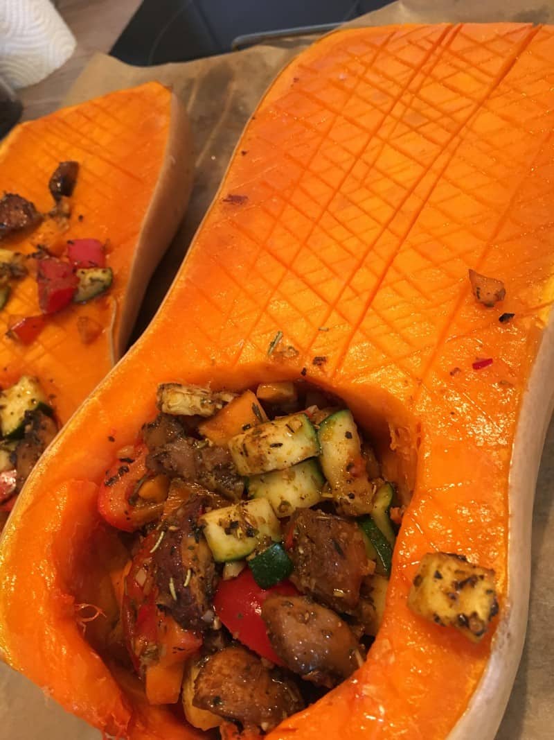 Preheat the oven to 180 degrees convection. Remove the pointed ends of the butternut squash, cut the squash in half and remove the seeds. Using a knife, score the inside of the squash crosswise, brush with a little oil and then season with the herbs, salt and pepper and bake the squash for about 20 minutes. In the meantime, cut the peppers, zucchini and a few tomatoes (or the vegetables of your choice) into small cubes, marinate briefly with a little oil, the paprika and curry powder, salt, pepper and a few herbs and sauté in the pan.